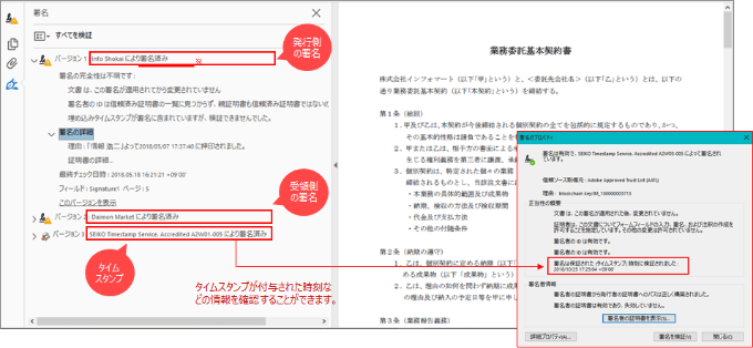 また、電子データにタイムスタンプを付与することによる時刻証明を合わせて、書面による契約と同様の証拠力を持たせています。