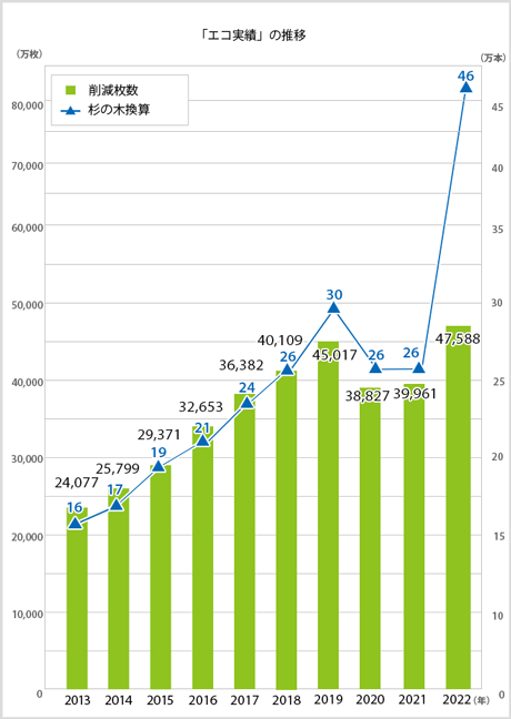 「BtoBプラットフォーム」における2022年の「ECO実績」は、A4紙伝票枚数4億7,588万枚、杉の木46万3,533本のCO2削減効果につながっています。