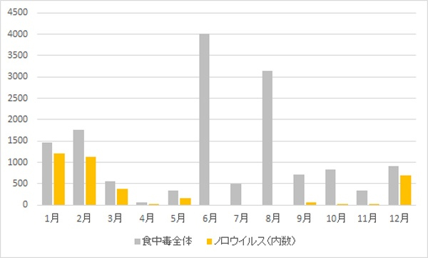 冒頭で述べた通り、ノロウイルスが原因で食中毒件数は冬に増加傾向となっています。1月では食中毒のうちの8割がノロウイルスと大きな割合を占めている。2020年の月間食中毒患者数は下記の通りです。