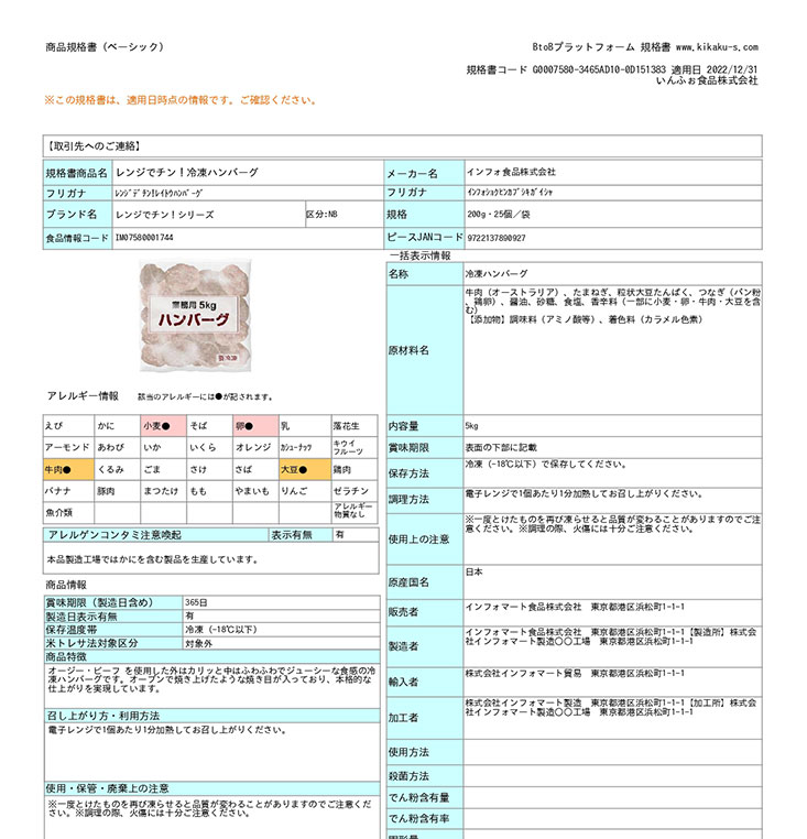 『BtoBプラットフォーム 規格書』は、フード業界で流通する規格書・成分表示の作成や受渡しをWeb上で行うためのクラウドサービスです。エクセルや紙での管理と比べて受渡しはもちろん、使用原材料、原産国、アレルギー、栄養成分等の情報も楽々検索!